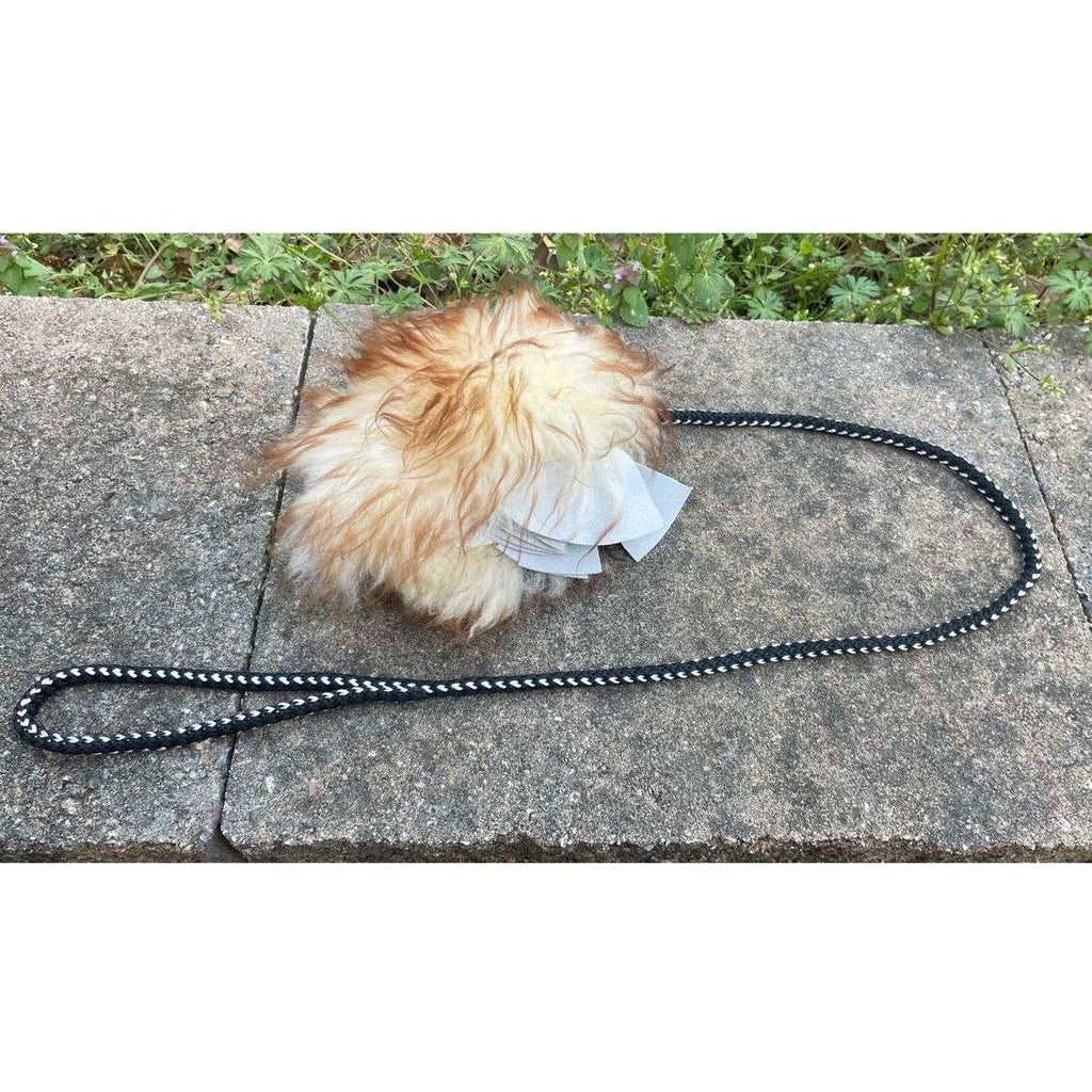 Puppy lure made of leather tassles and irresistable lambskin. Strong multirope string attached for easy play, dragging or attaching it to a pole. Great for puppies!